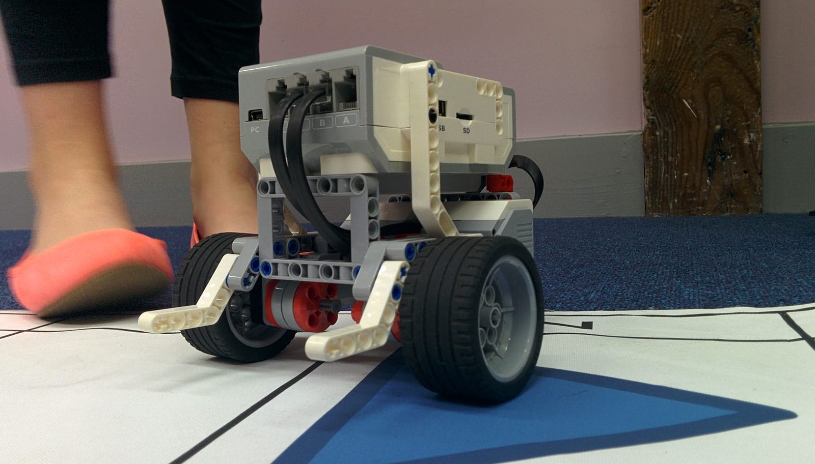 All easily connected the EV3s to computers by USB to transfer their instructions (created using an interface similar to what you might see with a Scratch program) and then tested out the EV3s' execution of the programs on ground sheets.