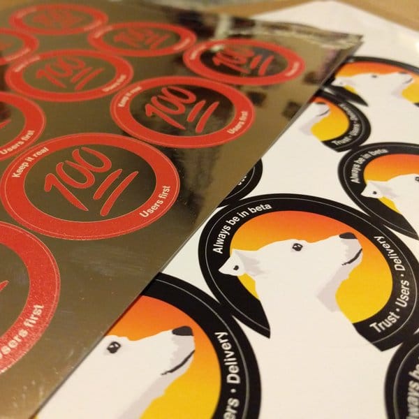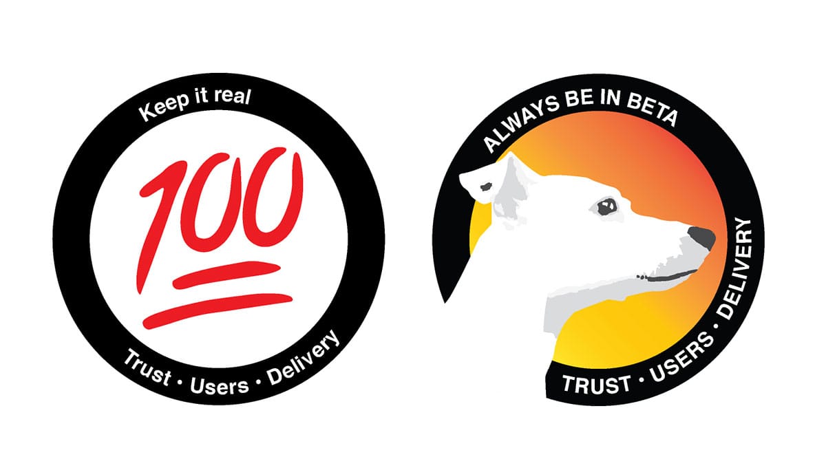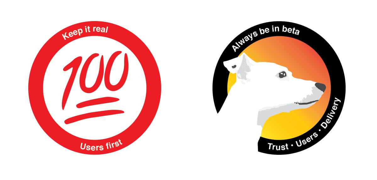 The sticker on the left is the 100 emoji. User centred design is all about keeping it real. Sometimes that is forgotten. Putting users first should always be a badge of pride. It was a quick idea I just did on screen to see how it looked. A little refinement and, yeah, let's get some of those printed!