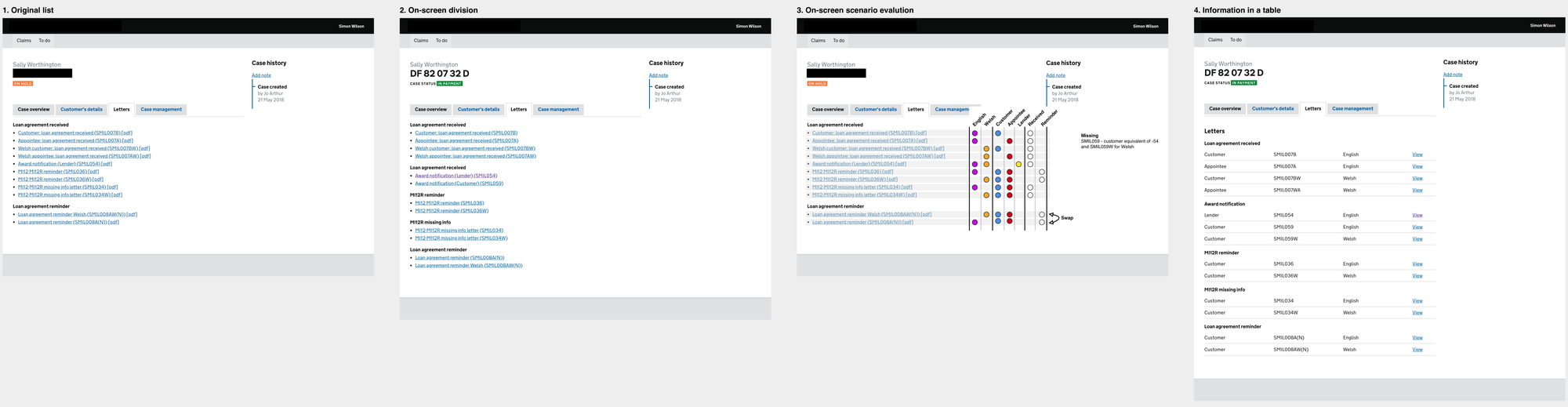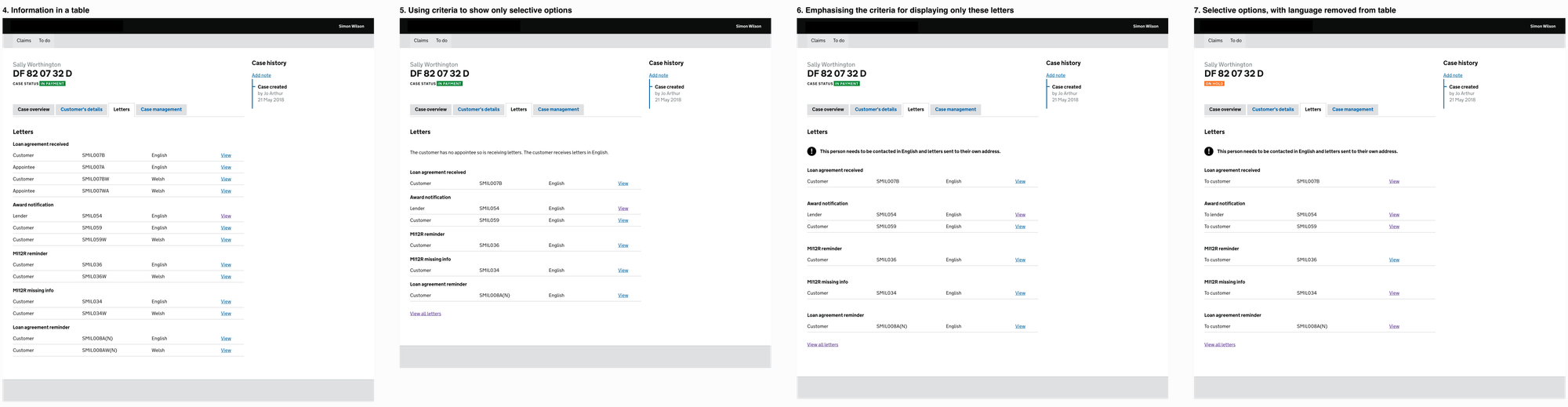 - This is number 5. Using some simple logic (worked out from the matrix) I created a scenario: the citizen is English and they have not nominated an appointee (which is indicated to the user with a message on screen). And because of the matrix work we know some letters do not need to accessed in this scenario. We could know this from data about the case. We can make this list context appropriate for the member of staff, reducing their options to only ones that would be necessary in this scenario. (There are three other scenarios.) If the DWP staff needed any of the other letters from the fuller list we’ll give them that option, as a link (which goes to screen 4).
